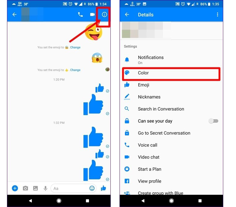 চ্যাটের কালার পরিবর্তন করতে চাইলে প্রথমে চ্যাট Conversation ওপেন করুন। এবার উপরের (i) অপশনে ট্যাপ করুন। এবার সেটিংস থেকে Color অপশনে ট্যাপ করুন। এখান থেকে আপনার পছন্দমতো রংটি সিলেক্ট করে নিন।
