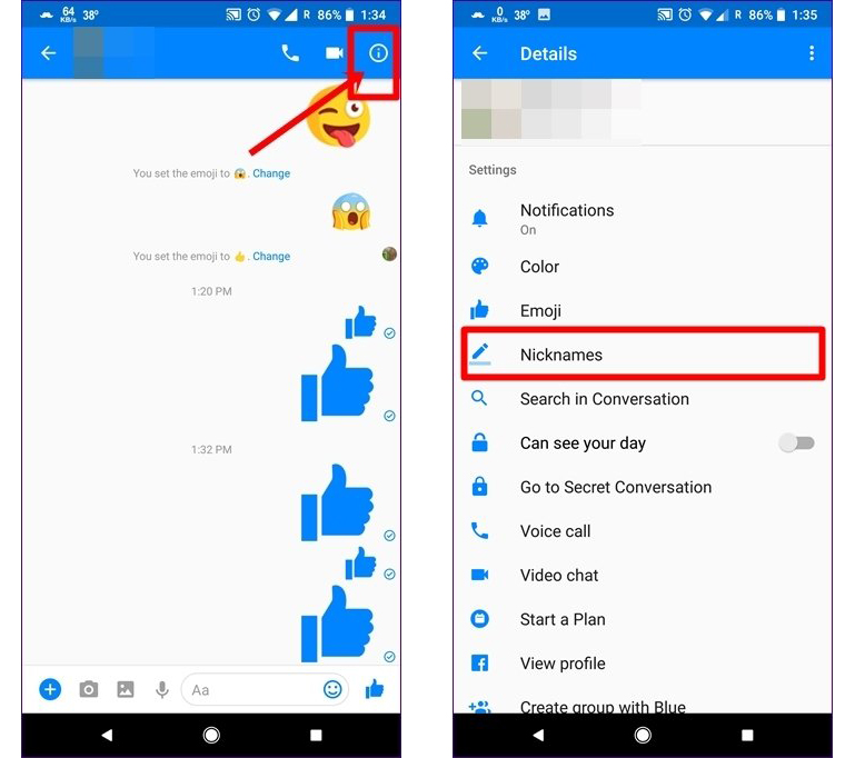 ছদ্মনাম ব্যবহার করতে চাইলে চ্যাট কনভারসেশনটি খুলুন। উপরের দিকে (i) আইকনে ট্যাপ করুন। এবার সেটিংস থেকে Nicknames অপশনে ট্যাপ করে আপনার এবং তার নিকনেম আপনি সেট করে দিতে পারবেন। একই ভাবে সেও আপনার এবং তার নিকনেম সেট করতে পারবে এবং পরিবর্তন ও মুছে দিতে পারবে।