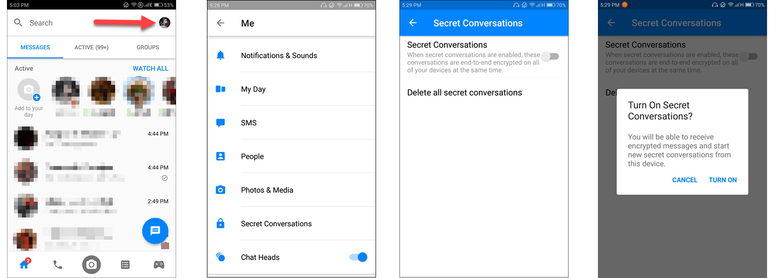 ১) প্রথমে মেসেঞ্জার চালু করুন। উপরের ডান দিকে আপনার প্রোফাইল আইকনে ট্যাপ করুন। বিভিন্ন অপশন লিস্ট আসবে এখান থেকে Secret Conversation অপশনে ট্যাপ করুন।