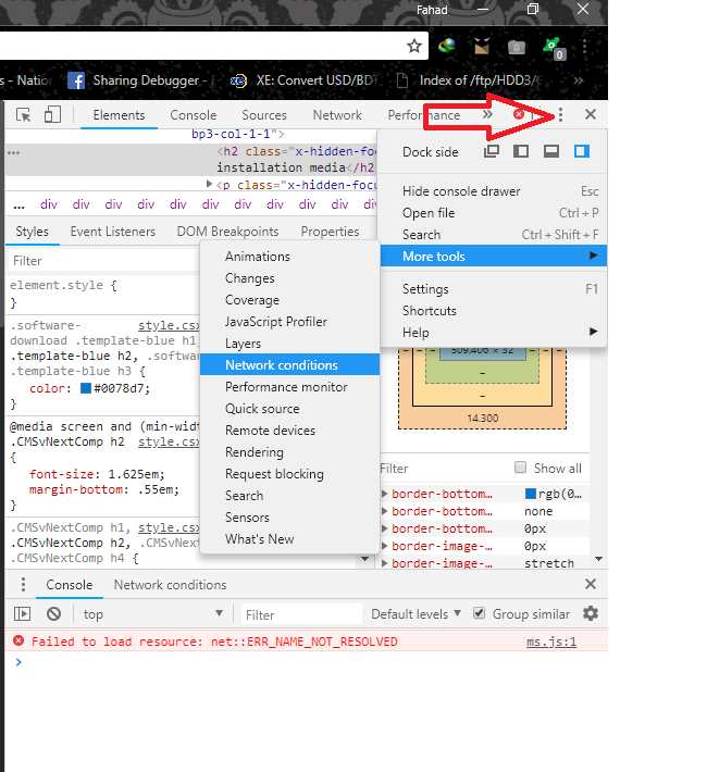 ৩) ডান দিকে ডেভেলপার টুলস উইন্ডো আসবে। এখান থেকে তিনটি ডটযুক্ত (ছবিতে দেখুন) অপশনে ক্লিক করে More Tools > Network conditions অপশনে ক্লিক করুন।
