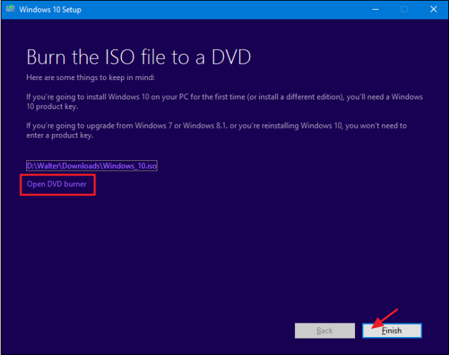 ৭) এবার উইন্ডোজ ১০ ডাউনলোড হতে থাকবে। এবং আপনাকে আপনার ইন্টারনেট স্পিডের উপর ভিক্তি করে বেশ খানিকটা সময় অপেক্ষা করতে হবে ডাউনলোড হবার জন্য। প্রায় ৪ গিগাবাইটের সাইজের এই iso ফাইলটি নামাতে গেলে কতটুকু সময় লাগবে সেটা আপনার নেটের স্পিডের উপর ক্যালকুলেশন করে বের করে নিন (না বের করতে পারলে নিচে টিউমেন্ট বক্সে টিউমেন্ট করুন আমি বলে দিচ্ছি)। ডাউনলোড শেষ হয়ে গেলে নিচের মতো উইন্ডো আসবে। এবার আপনার পিসিতে কোনো ডিভিডি ডিক্স বার্নার সফটওয়্যার ইন্সটল করা থাকলে Open DVD burner অপশনে ক্লিক করতে পারেন বা সরাসরি নিচের Finish বাটনে ক্লিক করুন।