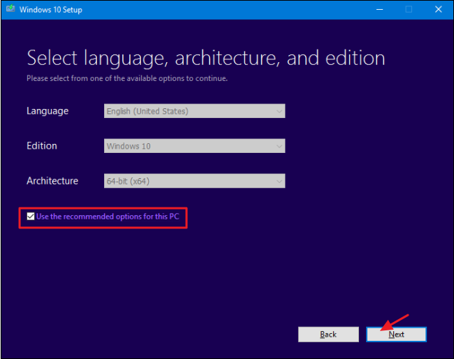 ৪) এবার কিছু জিনিস লক্ষ্যনীয় রয়েছে। আপনি যে পিসিতে বসে এই মিডিয়া টুলটি দিয়ে উইন্ডোজ ডাউনলোড করবেন; সে পিসিতেই যদি জেনুইন উইন্ডোজ ১০ দিতে চান তাহলে সরাসরি Next বাটনে ক্লিক করুন। কিন্তু অন্য পিসি বা ল্যাপটপে দিতে চাইলে এখানে "Use recommended options for this PC" বক্সে টিক চিহ্ন আপনাকে উঠিয়ে দিতে হবে এবং Language, Edition ও Architecture সিলেক্ট করতে হবে। এখানে একটু সাবধানতা অবলম্বন করতে হবে। কারণ আপনার লাইসেন্সটি যদি উইন্ডোজ ১০ প্রো ৩২ বিটের হয়ে থাকে তাহলে আপনি উইন্ডোজ ১০ হোম ৬৪ বিট ইন্সটল দিতে পারবে না (ডাউনলোড করতে পারবেন কিন্তু ইন্সটল দিয়ে জেনুইন ভেলিড করতে পারবেন না)। তাই প্রথমে আপনার ওই পিসির লাইসেন্স কীটি কোন সংষ্করণের কোন বিটের জন্য আগে সেটা জেনে নিন। তারপর এখানে Language এর স্থানে English বা আপনার লাইসেন্সে যা আছে তা সিলেক্ট করুন, Edition বক্সে উইন্ডোজ ১০ এর কোন সংষ্করণটি আপনার লাইসেন্সে রয়েছে সেটা নির্ধারণ করুন এবং সর্বশেষে Architecture ঘরে ৩২ নাকি ৬৪বিট উইন্ডোজ সেটা সিলেক্ট করে দিন। তারপর Next বাটনে ক্লিক করুন।