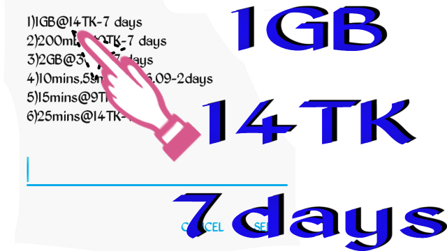 ঐখান থেকে যেখানে লেখা আছ 1gb 14 tk 7days সেই নম্বরটা সেন্ট করলে ২ টা option আসবে 1। Bye, 2। Cencel