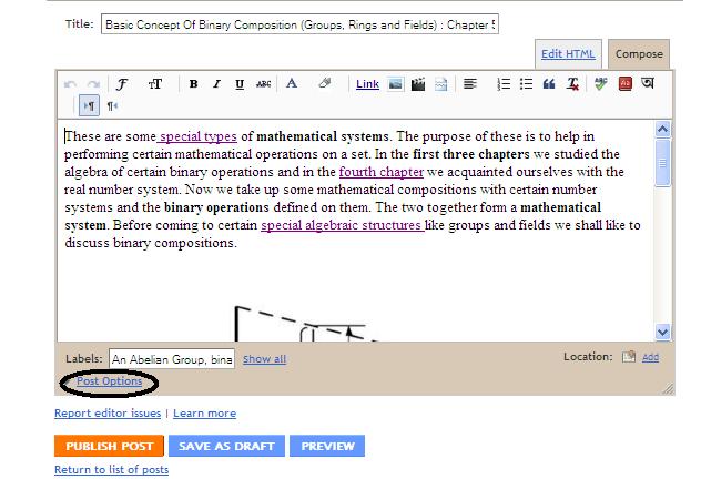 ৫। এখন পোষ্ট এর শেষের দিকে Labels: এর নিচে Post Options এ ক্লিক করুন, নিচের ছবির মতন।