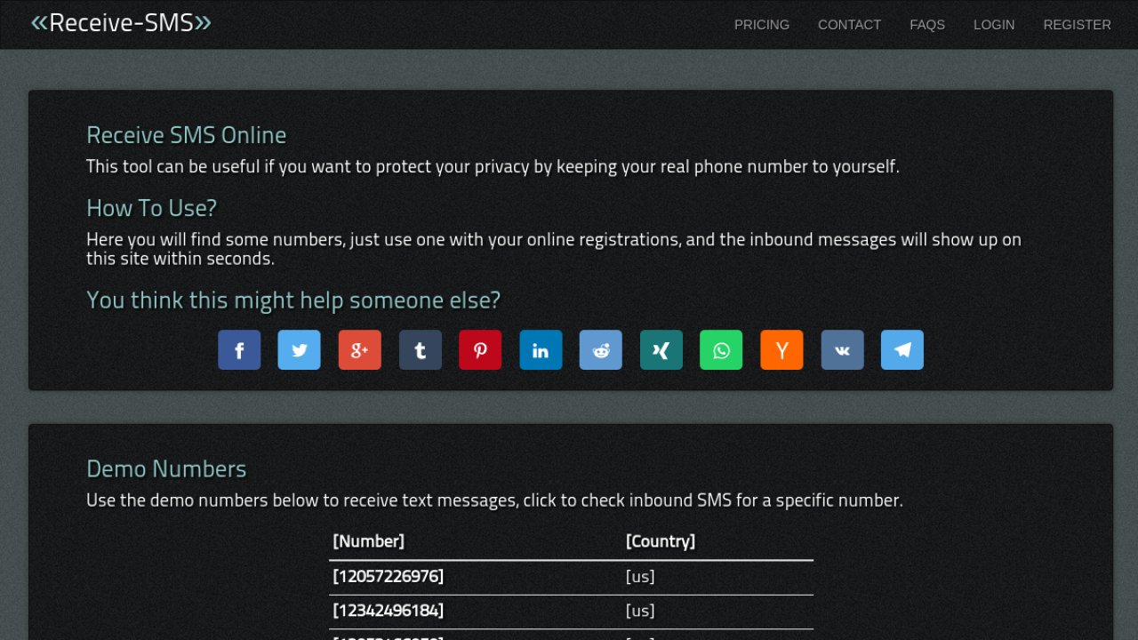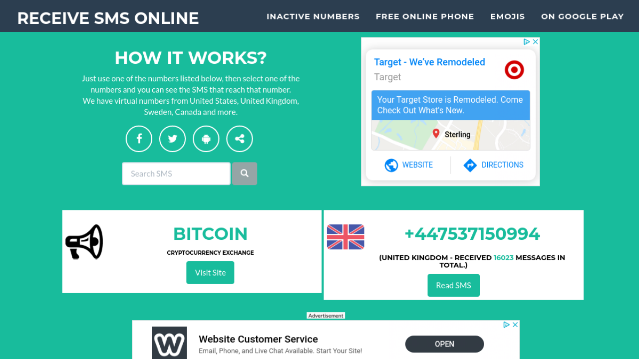 এই ওয়েবসাইটটি খুব দরকারী বিভিন্ন সেবা ভেরিফাই করার জন্য যেমনঃ Google, Yahoo, Microsoft, Amazon, VK ইত্যাদি। আর এটা কিছু ভার্চুয়াল মোবাইল ফোন নাম্বার প্রদান করে যার মাধ্যমে আপনারা এসএমএস রিসিভ করতে পারবেন, কোন রকম রেজিস্ট্রেশন ছাড়াই, ডিরেক্টলি যেকোন নাম্বার সিলেক্ট করেই Read SMS বাটনে ক্লিক করলেই আপনি সকল এসএমএস দেখতে পারবেন। এছাড়াও আপনি চাইলে আপনার জন্য ভার্চুয়াল নাম্বার কিনতে পারবেন কিছু ফী প্রদান করার মাধ্যমে যদি আপনার দরকার হয়।