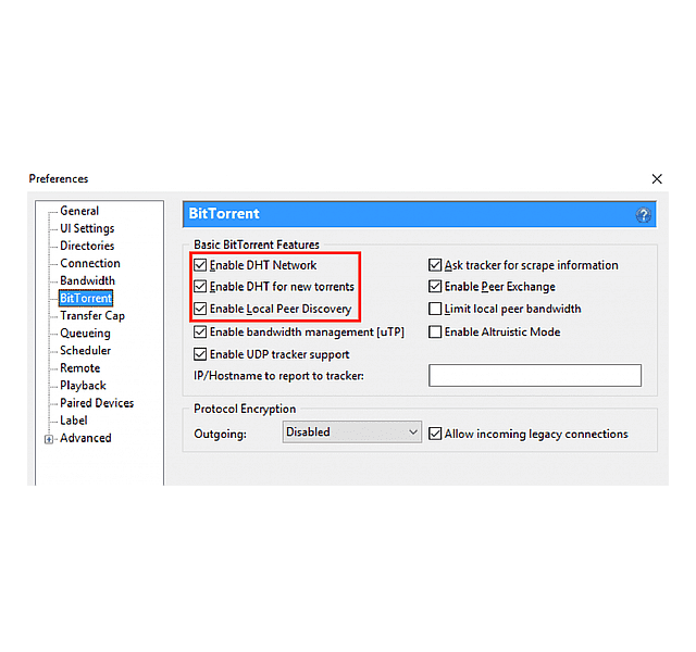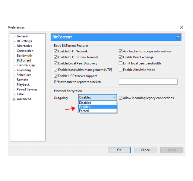 প্রথমে Options > Preferences > BitTorrent যান, “Protocol Encryption” এটা “Enabled” করে দিন এবং “Allow incoming legacy connections” টিক দিয়ে দিন।