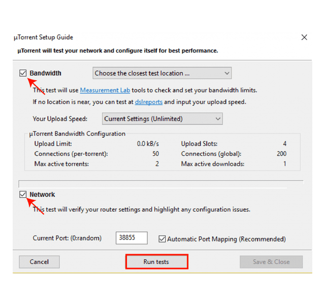 Bandwidth এবং Network বক্সে টিক দিন, Choose the closest server সিলেক্ট করুন এবং Run tests ক্লিক করুন।