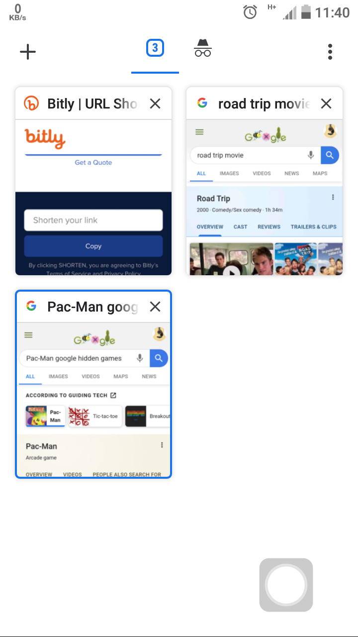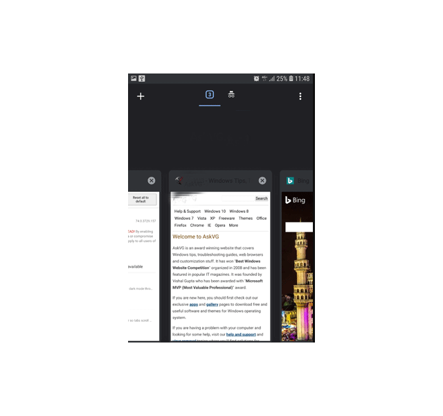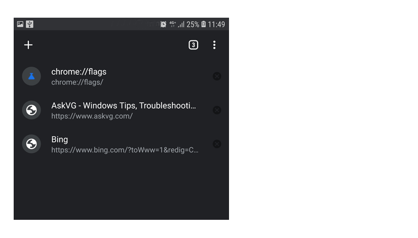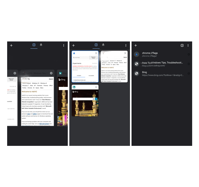 আমরা স্বাভাবিক ভাবে যখন ক্রোম ব্যবহার করি এবং কোন ট্যাবে যেতে চাই তখন ট্যাব আইকনে ক্লিক করে এবং নিচের মত স্ক্রিন দেখতে পাই। এটি অনেকের কাছেই ভাল লাগে না। কারণ এখানে পুরো পেজ দেখা যায় না তেমনি বুঝা যায় কোন ট্যাবে একটিভ আছি।