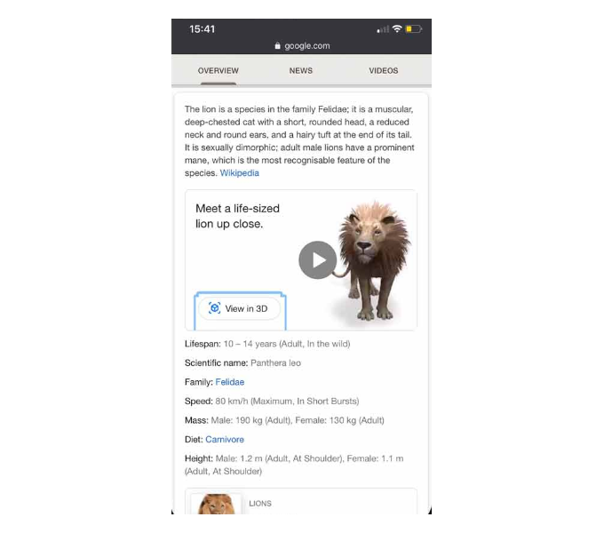 আপনার ফোন থেকে ক্রোমে যান এবং যেকোনো একটি প্রাণীর নাম লিখুন যেমন আমি লিখলাম lion, এবার নিচের দিকে যান দেখবেন View in 3D বলে একটি অপশন পাবেন।