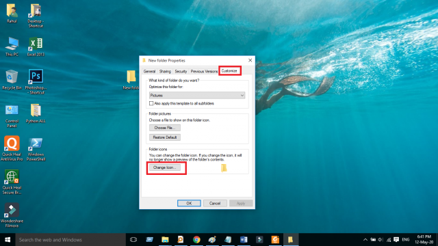 Properties tab ওপেন হওয়ার পর যথাক্রমে Customize এবং Change Icon এ ক্লিক করবো।