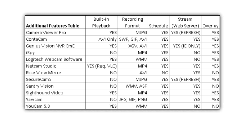 আমরা এখানে দেখতে পাচ্ছি কোন কোন সিকিউরিটি সফটওয়্যার গুলো বিল্ড-ইন ভিডিও প্লে করে এবং কোন গুলো আলাদা সফটওয়্যার ব্যবহার করে। আরও দেখতে পাচ্ছি ভিডিও ফরমেট গুলো। এই টেবিলে আমরা আরও জানতে পারছি কোন গুলো লাইভ স্ট্রিমিং করতে পারে। এখানে Rear View Mirror, Sentry Vision, Sighthound Video এবং YouCam সফটগুলোতে কোন ধরনের টেক্সট ওভার-লেপ হয় না। মানে ভিডিও ডেট এবং সময় দেখায় না।
