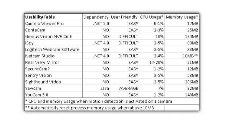 সর্বশেষ আমরা তুলনা করব কোন সফটওয়্যারটি বেশি ইউজার ফ্রেন্ডলি অথবা কতটা মেমোরি দরকার হয়। টেবিলে আমরা সব গুলো সফটওয়্যার এর CPU Usage এবং Memory Usage দেখতে পাচ্ছি। এখানে একটি বিষয় লক্ষণীয় সেটা হলে, CPU Usage গুলো একটি ক্যামেরা ইন্সটল দেওয়ার পর রেকর্ড করা হয়েছে।