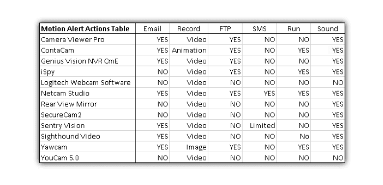 প্রতিটি সিকিউরিটি ক্যামেরার জন্যই ইমেইল নোটিফিকেশন গুরুত্বপূর্ণ। মোশন ডিটেকশনের সাথে সাথে ইমেইল অথবা মেসেজ আমার সিকিউরিটি আরও বাড়িয়ে দিতে সাহায্য করে। সুতরাং এই টেবিলের মাধ্যমে আমরা দেখতে পাচ্ছি কোন কোন সফটওয়্যার গুলো ইমেইল এবং টেক্সট মেসেজ পাবেন। আরও দেখতে পাচ্ছি কোন কোন সফটওয়্যার ftp সাপোর্ট করবে।
