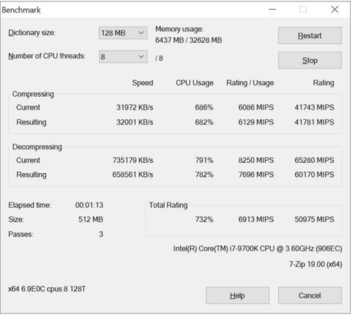 7-zip কে সাধারণত বেঞ্চ-মার্ক টুল বলা হয় না তবে এটি দিয়ে CPU রিভিউ করা যায়। এটি স্বাভাবিক ভাবে ফাইল এক্সট্রাকটর সফটওয়্যার হলেও এটি দিয়ে কমবেশি কিছু টেস্টিং ও করা যায়।