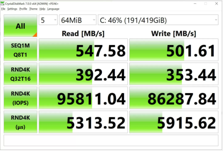 নিচে SATA কানেক্টেড একটি SSD রেজাল্ট দেখাচ্ছে। এটি দাবী করছে এর Sequential read/write রেট 540 এবং 520 MB/s।