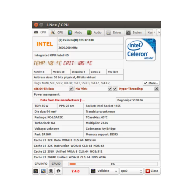 I-Nex সফটওয়্যারটি ডেভেলপ করছে পোল্যান্ড এর ডেভেলপাররা। লিনাক্সের এই টুলটি অনেকটা CPU-Z এর মতই কাজ করে। তাছাড়া এটি অডিও, অপারেটিং সিস্টেম সম্পর্কে অতিরিক্ত কিছু ইনফরমেশন দিয়ে থাকে।