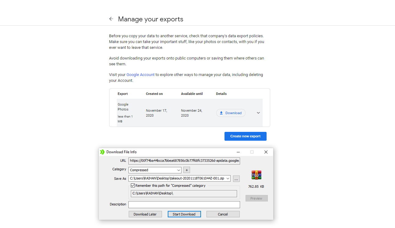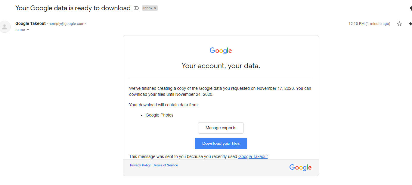 প্রক্রিয়াটি কমপ্লিট হয়ে গেলে আপনার জিমেইলে একটি নতুন মেইল আসবে। Download Your Files বাটনে ক্লিক করুন, আবার সাইন ইন করা লাগতে পারে, ইমেইল পাসওয়ার্ড দিন।
