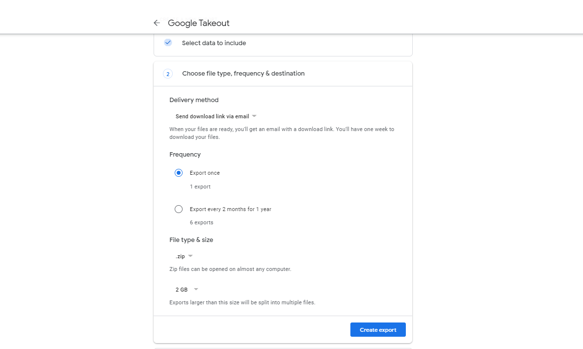 এবার আপনি আপনার Delivery Method সিলেক্ট করুন। চাইলে একবার ব্যাকআপ নিতে পারেন অথবা বছরে ২ মাস পর পরও নিতে পারেন। আমি Send Download Link Via Email এ ক্লিক করলাম। Create Export এ ক্লিক করুন।