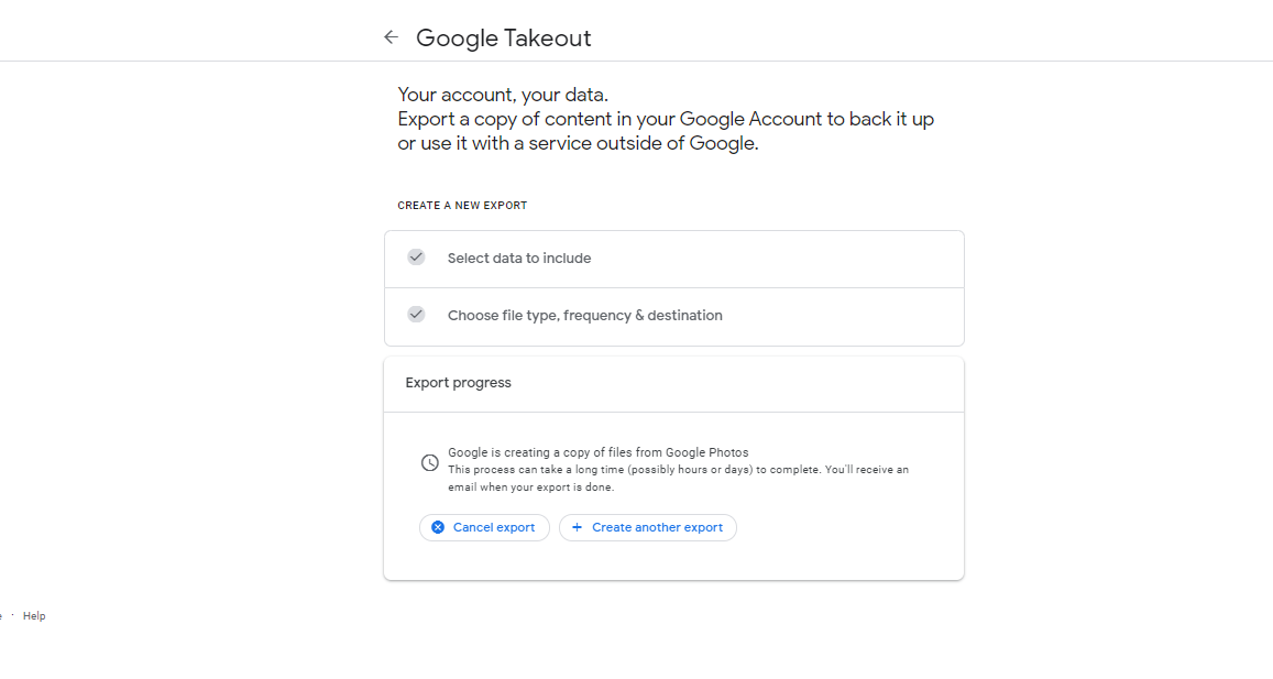 Google আপনার ছবি Export করা শুরু করবে। আপনার ছবির পরিমাণ অনুযায়ী সময় নেবে। চাইলে ক্লিক করে প্রসেস ক্যান্সেলও করতে পারেন।