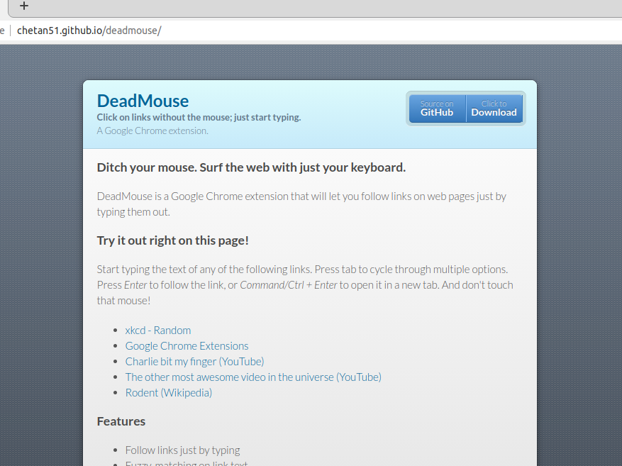মাউস ছাড়া ওয়েব ব্রাউজ করার আরেকটি দারুণ এক্সটেনশন হচ্ছে DeadMouse। তবে এটি Vimium এবং Tridactyl এর চেয়ে ভিন্ন ভাবে তৈরি করা। এটি Hint না দিয়ে এমন ব্যবস্থা রেখেছে আপনি যেখানে ক্লিক করতে চান সেটা টাইপ করলেই হবে।