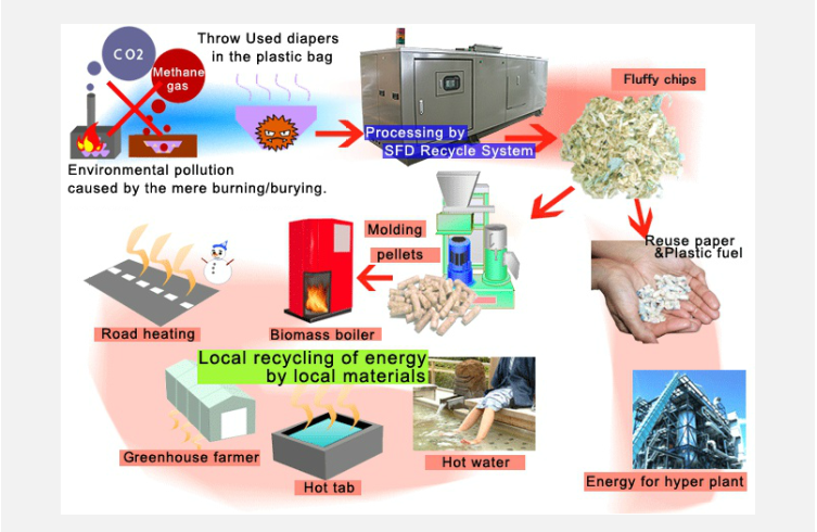 SFD Recycling System প্রথমে ডায়াপার গুলো সংগ্রহ করে, তারপর সেগুলো জীবাণুমুক্ত করে, পালভারাইজ করে, তাদের পেটেন্ট মেশিনে শুকায়, এবং উপযুক্ত চুল্লীতে জ্বলিয়ে বায়োগ্যাস তৈরি করে। প্রতি কেজি রিসাইকেল সিস্টেমে প্রায় 5000 kcal বিদ্যুৎ উৎপাদন সম্ভব হয়।