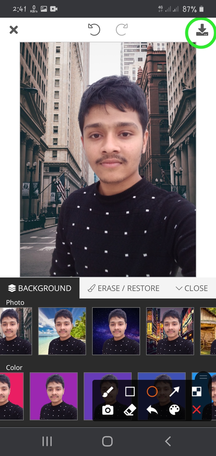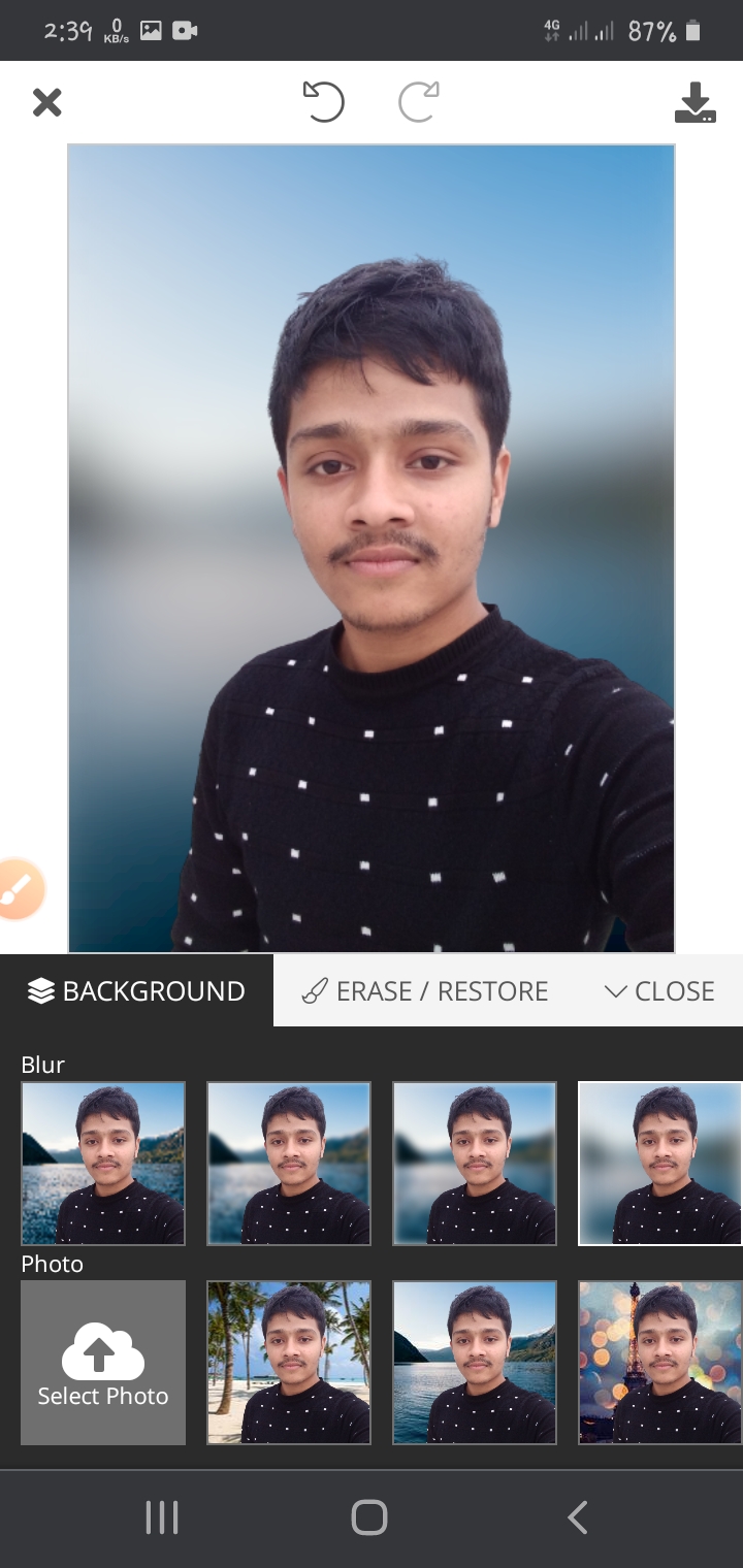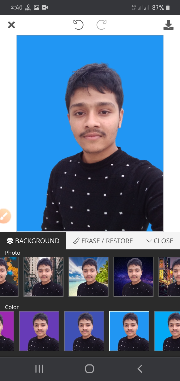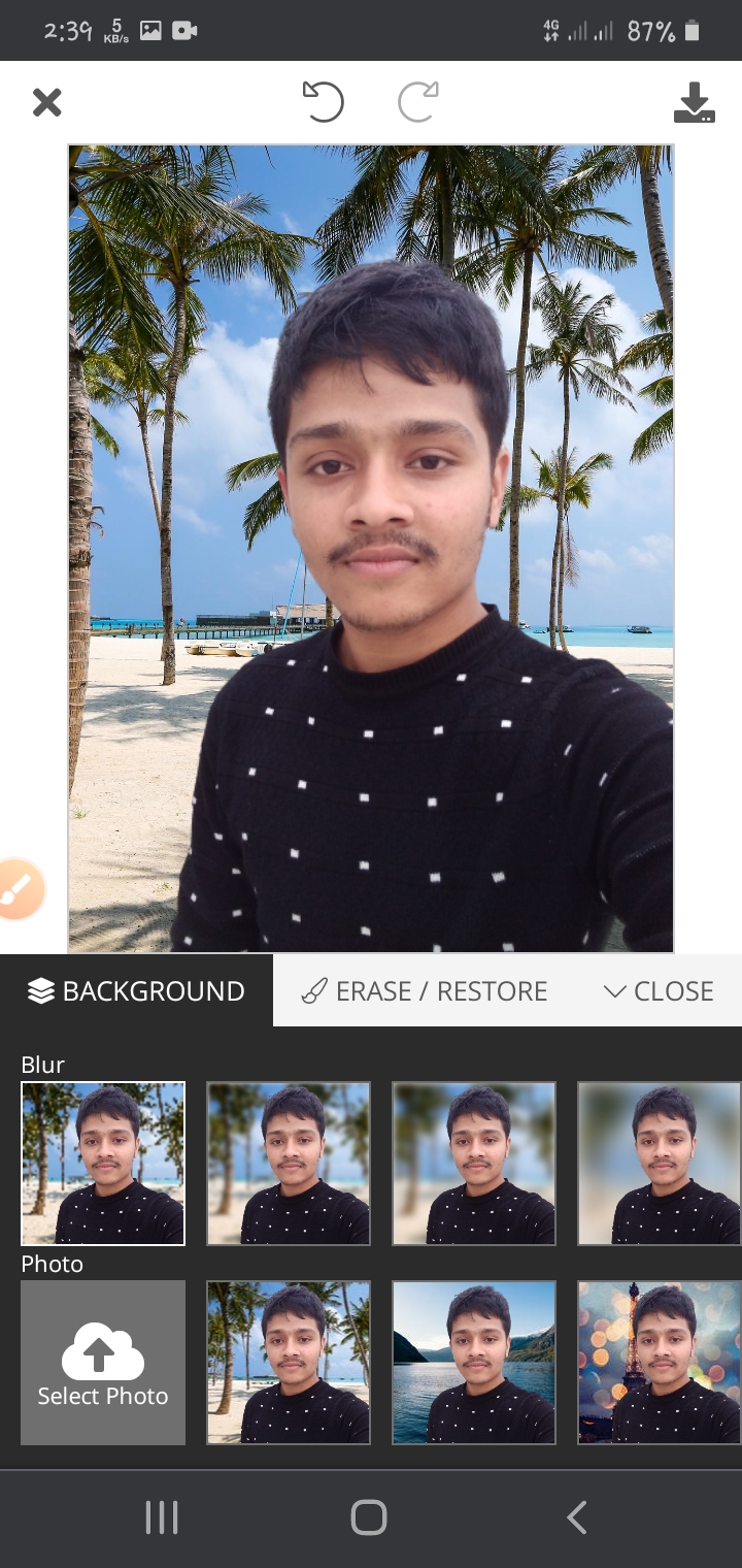 ৮. এরপর যে পেইজটি আসবে এখান থেকে আপনি এক কালার ব্যাকগ্রাউন্ড যুক্ত করতে পারেন বা সিনারি ব্যাকগ্রাউন্ড যুক্ত করতে পারেন বা ব্লোর ব্যাকগ্রাউন্ড যুক্ত ছবি তৈরি করতে পারেন।