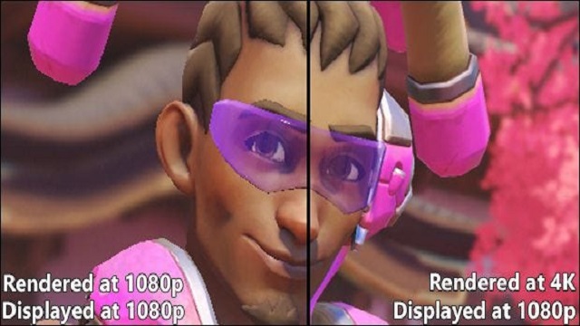 উপরের ছবিটি খেয়াল করুন, Overwatch গেম এর একটি ক্যারেকটারকে দুই ভাবে রেন্ডার করা হয়েছে। এখানে বলে রাখা ভাল, ডিসপ্লে রেজুলেশন হচ্ছে 1080p যা মনিটরটির সর্বোচ্চ রেজুলেশন। খেয়াল করুন এই রেজুলেশনে বাম পাশে গেমটির গ্রাফিক্সকে 1080p তে রেন্ডার করা হয়েছে অন্যদিকে ডানপাশে 4K (3840×2160) রেজুলেশনে রেন্ডার করা হয়েছে৷ এখানে উল্লেখ্য, আমি এই প্রক্রিয়ায় উল্লেখযোগ্যভাবে নিম্ন ফ্রেমরেট পর্যবেক্ষণ করেছি। বেশির ভাগ যুদ্ধের দৃশ্য গুলোতে ফ্রেমরেট 40s থেকে 30s এ নেমে এসেছিল।