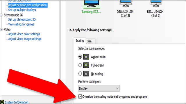 প্রথমে NVIDIA কন্ট্রোল প্যানেলে চলে যান, “Adjust desktop size and position” এ ক্লিক করুন এবং “Override the scaling mode set by games and programs” এ টিক দিন।