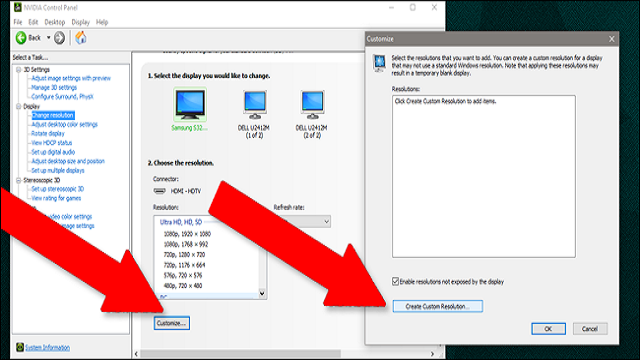 এবার বামপাশের স্ক্রিন থেকে Display কলামের নিচ থেকে “Change resolution” এ ক্লিক করুন। ডান পাশে এসে Customize এ ক্লিক করে “Create Custom Resolution" সিলেক্ট করুন৷