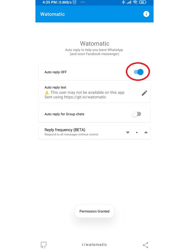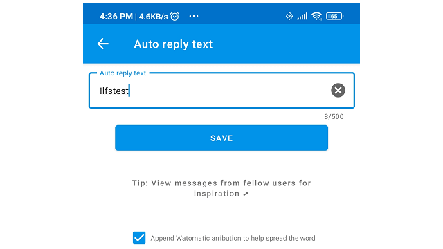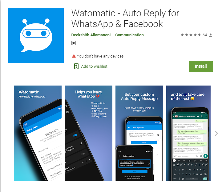Watomatic একটি ফ্রি অ্যান্ড্রয়েড অ্যাপ যা আপনার অবর্তমানে WhatsApp এ স্বয়ংক্রিয় মেসেজ রিপ্লাই দেবে। ওপেন সোর্স এই অ্যাপটি অটোমেটিক ভাবে ইনকামিং মেসেজ গুলো ডিটেক্ট করবে এবং আপনার আগে নির্ধারণ করা মেসেজ গুলো সেন্ট করবে। এই অ্যাপটি শুধু মাত্র ডাইরেক্ট মেসেজের ক্ষেত্রেই নয় গ্রুপ কনভারসেশনেও কাজ করে।