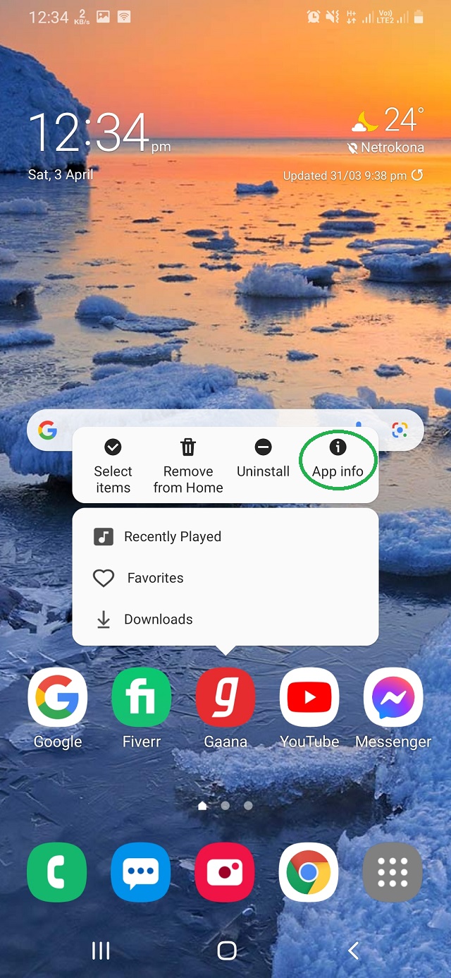 আপনি চাইলে হোমস্ক্রিন থেকেও সরাসরি নির্দিষ্ট অ্যাপে চলে যেতে পারেন, এজন্য অ্যাপটিতে কিছুক্ষন প্রেস করে রাখুন তারপর App info তে ক্লিক করুন।