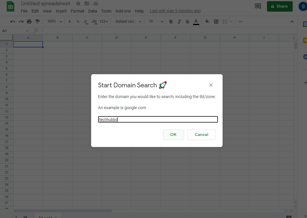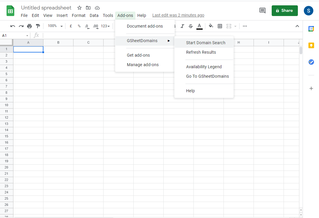 New Document থেকে Addons> GSheetDomains> Start Domain Search এ ক্লিক করুন