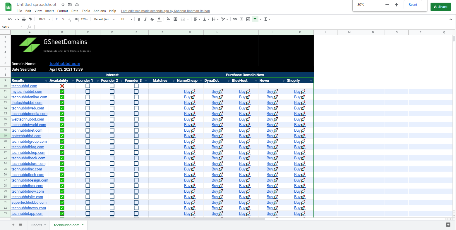 আর এভাবেই Google Sheet থেকে সরাসরি এভেইলেবল ডোমেন খুঁজে পেতে আপনাকে সাহায্য করবে GSheetDomains। সহজে এবং কম সময়ে ব্যক্তিগত বা ব্যবসায়ীক কাজে ডোমেইন খুঁজে পেতে আপনার জন্য দারুণ হতে পারে GSheetDomains।