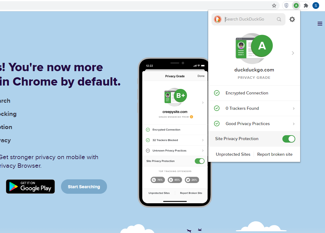 DuckDuckGo Privacy Essentials হচ্ছে একটি ফ্রি ব্রাউজার এক্সটেনশন যা আপনার ব্রাউজিংকে আরও নিরাপদ করবে। এক্সটেনশনটি আপনার প্রবেশ করা ওয়েবসাইটের এনালাইসিস করে প্রয়োজনীয় ব্যবস্থা নেবে। আপনার ব্যক্তিগত ডেটা গুলোর সর্বোচ্চ নিরাপত্তা নিশ্চিত করবে এই এক্সটেনশনটি। যেকোনো ওয়েবসাইটে প্রবেশ করলে এটি আপনাকে জানাবে নির্দিষ্ট ওয়েবসাইটটি কতটা নিরাপদ। এড ট্র্যাকারদের ব্লক করার পাশাপাশি এটি অনিরাপদ কানেকশন গুলোকে Encrypted করবে।
