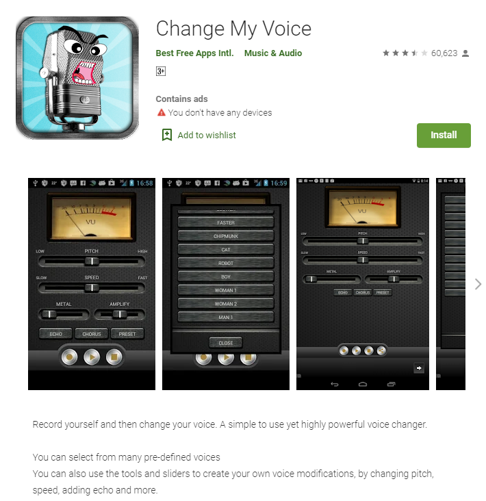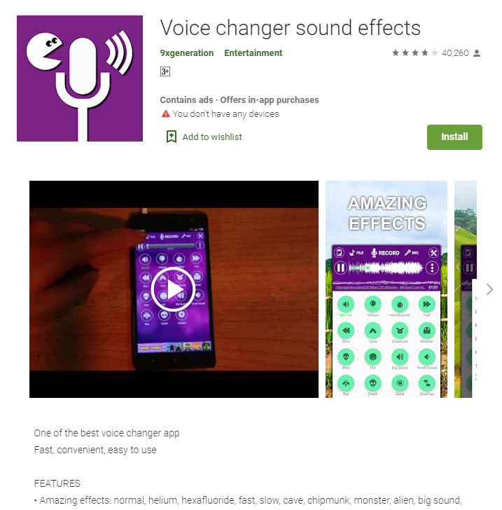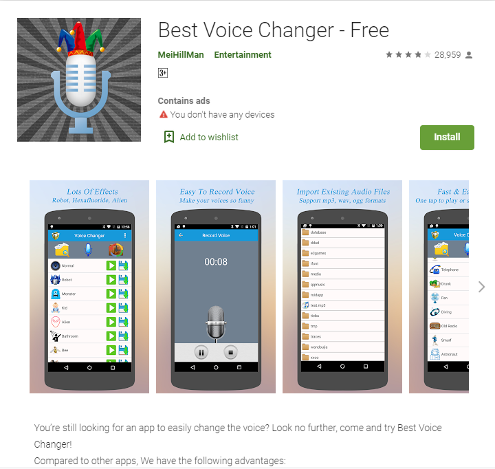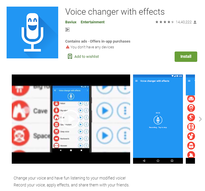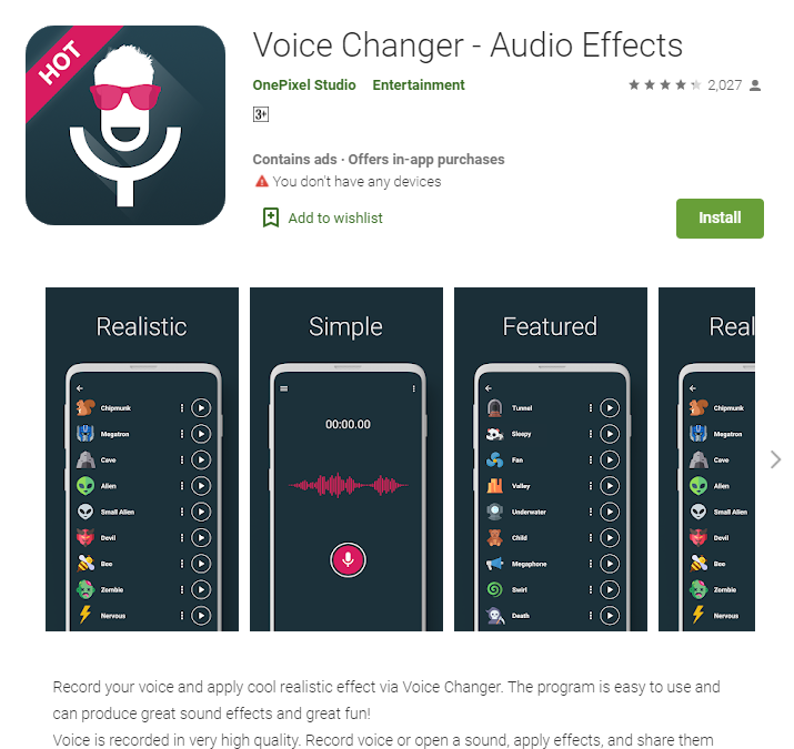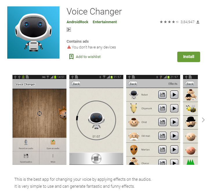 অ্যান্ড্রয়েডের অন্যতম সহজ এবং ফ্রি Voice Changer অ্যাপ হচ্ছে Voice Changer – Audio Effects। আপনি ভয়েস রেকর্ড করে এই অ্যাপটির মাধ্যমে সত্যিকারের ইফেক্ট দিতে পারবেন। অ্যাপটিতে robot, alien, drunk, chipmunk, cave, underwater, devil, এর মত মোট ২৫ টি ভিন্ন ভিন্ন ইফেক্ট পাবেন।