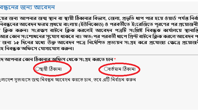 নিবন্ধক কার্যালয়ের জন্য আপনার জন্ম স্থান বা স্থায়ী ঠিকানার বিভাগ, জেলা, প্রভৃতি ধাপ পার হয়ে ওয়ার্ড পর্যন্ত নির্বাচন করতে হবে। অনলাইন জন্ম নিবন্ধনের আবেদন ফরম প্রথমে বাংলায় (ইউনিকোড) ও পরবর্তীতে ইংরেজিতে পূরণের পর প্রয়োজনীয় সম্পাদনা করে সংরক্ষণ বাটনে ক্লিক করুন। সংরক্ষণ বাটনে ক্লিক করলেই আবেদন পত্রটি সংশ্লিস্ট নিবন্ধক কার্যালয়ে স্থানান্তিরত হয়ে যাবে, আবেদনকারীর আর কোন সংশোধনের সুযোগ থাকবে না। অতঃপর পরবর্তী ধাপে প্রিন্ট বাটনে ক্লিক করলে আবেদন পত্রের মুদ্রিত কপি পাবেন। সনদের জন্য ১৫ দিনের মধ্যে উক্ত আবেদন পত্রে নির্দেশিত প্রত্যয়ন সংগ্রহ করে প্রযোজ্য ক্ষেত্রে প্রয়োজনীয় প্রমাণপত্রের সত্যায়িত কপিসহ নিবন্ধক অফিসে যোগাযোগ করুন।