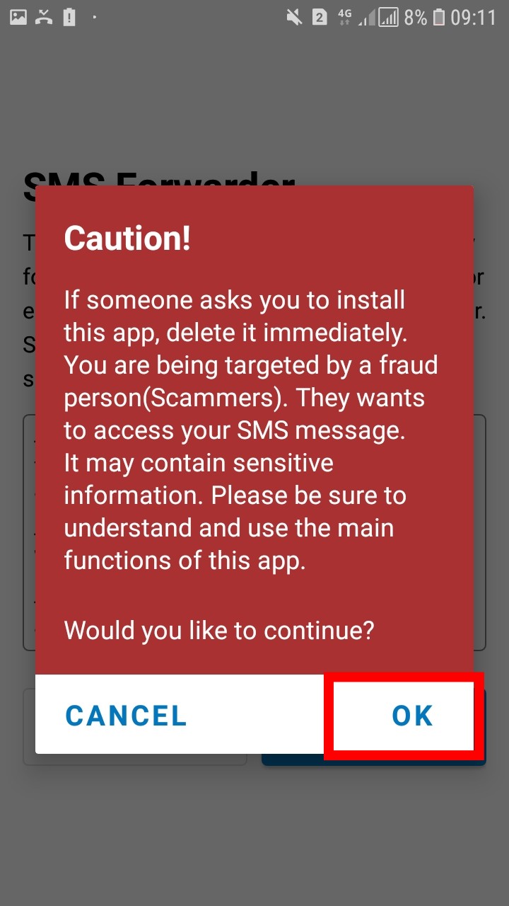 ৭. এখানে একটি সতর্কবার্তা দেওয়া হবে যে এটা আপনার ফোনে কেউ ইন্সটল করছে কি না সেটা খেয়াল রাখার জন্য। এই অ্যাপস আপনার ফোনে ইন্সটল করা মানেই হচ্ছে কেউ আপনার ফোন থেকে SMS Forward করে তার মোবাইলে নিতে চাচ্ছে। তাই সাবধান থাকার জন্য এই সতর্ক বার্তা দিবে নিচ থেকে Ok বার্টনে ক্লিক করে দিবেন।