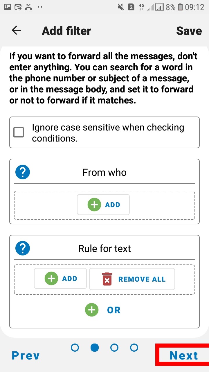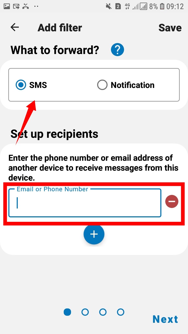 ১১. এখানে খেয়াল করুন উপরে Sms সিলেক্ট করাই আছে। নিচে যে নাম্বারে আপনি Sms Forward করতে সেই নাম্বার দিতে হবে। নাম্বার দেওয়ার সময় অবশ্যই মনে রাখতে হবে নাম্বারের Country Code দিতে হবে। নাম্বার দেওয়া হয়ে গেলে Next এ ক্লিক করবেন।