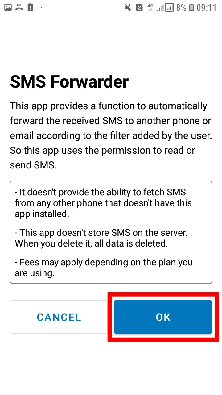 ৬. এখানে SMS Forward করার জন্য আপনার Permission চাইবে Ok বার্টনে ক্লিক করবেন।