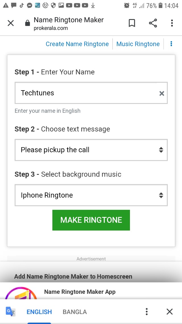 ৩. সেখানে ক্লিক করার পর আপনার নামে রিংটোন তৈরি করার জন্য এর মূল পেজটি ওপেন হয়ে যাবে। সেখানে আপনাকে আপনার কিছু তথ্য দিতে হবে। যেমন ধরুন আপনার নাম কি? অর্থাৎ রিংটনে কোন নামটি বলবে সে নামটি দেবেন। তারপরে আপনি কোন ধরনের রিংটোন সেট করতে চান অর্থাৎ কোন মিউজিক টি আপনার নামের সাথে রাখতে চান সেটি সিলেক্ট করবেন এবং সে রিংটনে আপনার নাম ছাড়া আর কি কি বলবে সেটি সিলেক্ট করবেন। তারপর মেক রিংটোন লেখায় ক্লিক করবেন।