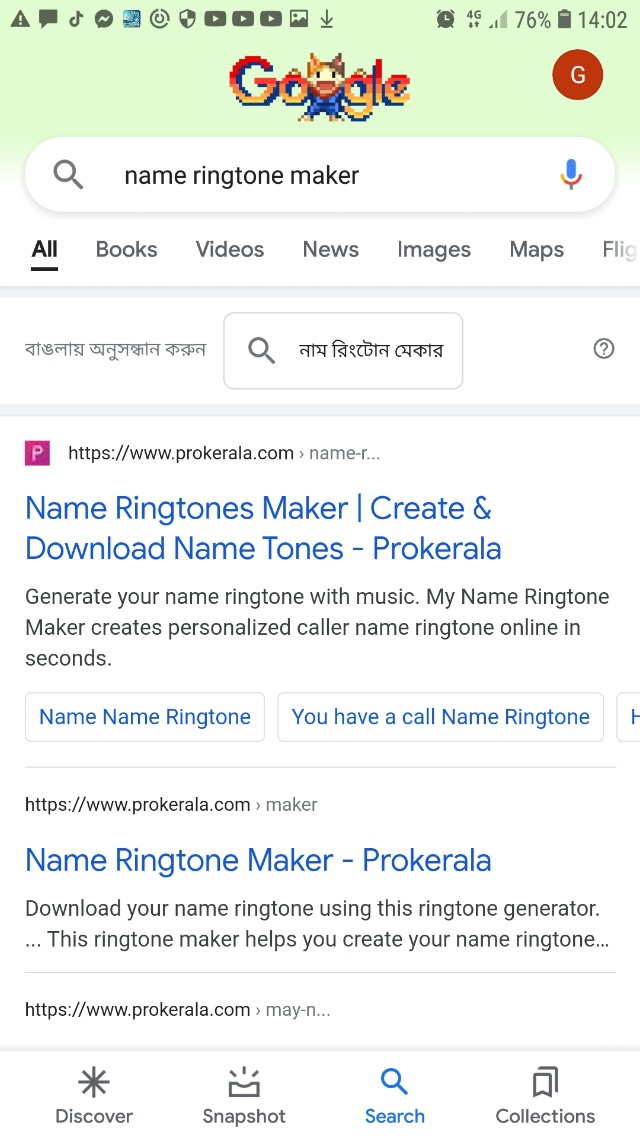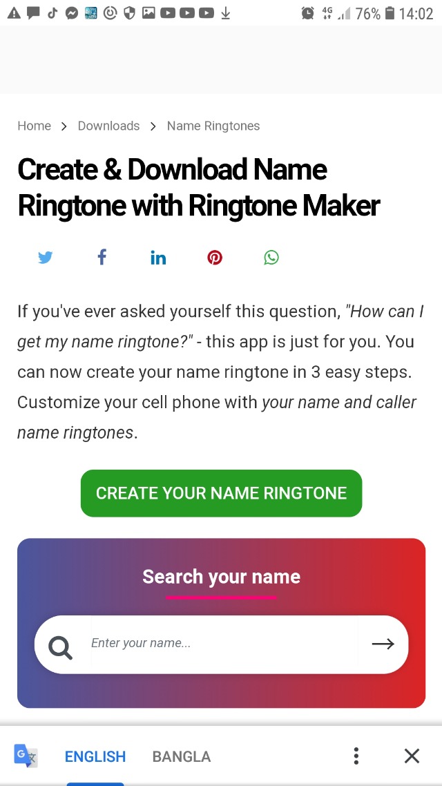১. তো বন্ধুরা এর জন্য প্রথমত আপনি আপনার মোবাইল কিংবা কম্পিউটারের ক্রোম কিংবা গুগল ওপেন করবেন। তারপর সার্চ বারে গিয়ে সার্চ করবেন name ringtone maker লিখে। তারপর আপনাকে গুগল যে সার্চ রেজাল্ট গুলো সাজেস্ট করবে সেখান থেকে আপনি ওর প্রথম লিঙ্কে ক্লিক করবেন অর্থাৎ প্রথম ওয়েবসাইটটিতে যাবেন যেমনটি নিচের স্ক্রীনশট এ দেখানো হয়েছে।