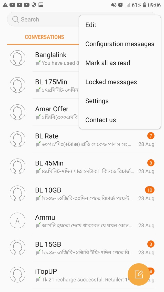 ১. এর জন্য প্রথমত আপনাকে আপনার মেসেজ অ্যাপ টিতে প্রবেশ করতে হবে এবং প্রথম এই অ্যাপটি ওপেন করার পর আপনি উপরে দেখতে পাবেন মেনু অপশন আছে। প্রথমত মেনু অপশন এ ক্লিক করবেন।