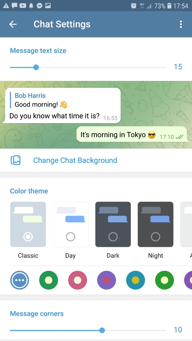 এছাড়াও আপনি আপনার ঐ থিমে আপনার ছবিও লাগাতে পারবেন। যাইহোক আপনারা যদি ছবি না লাগাতে চান তাহলে ডার্ক মোড করে রাখতে পারেন। এতে করে আপনার টেলিগ্রাম অ্যাপটির সৌন্দর্য বৃদ্ধি পাবে এবং কথোপকথন থিম পরিবর্তন হয়ে যাবে।