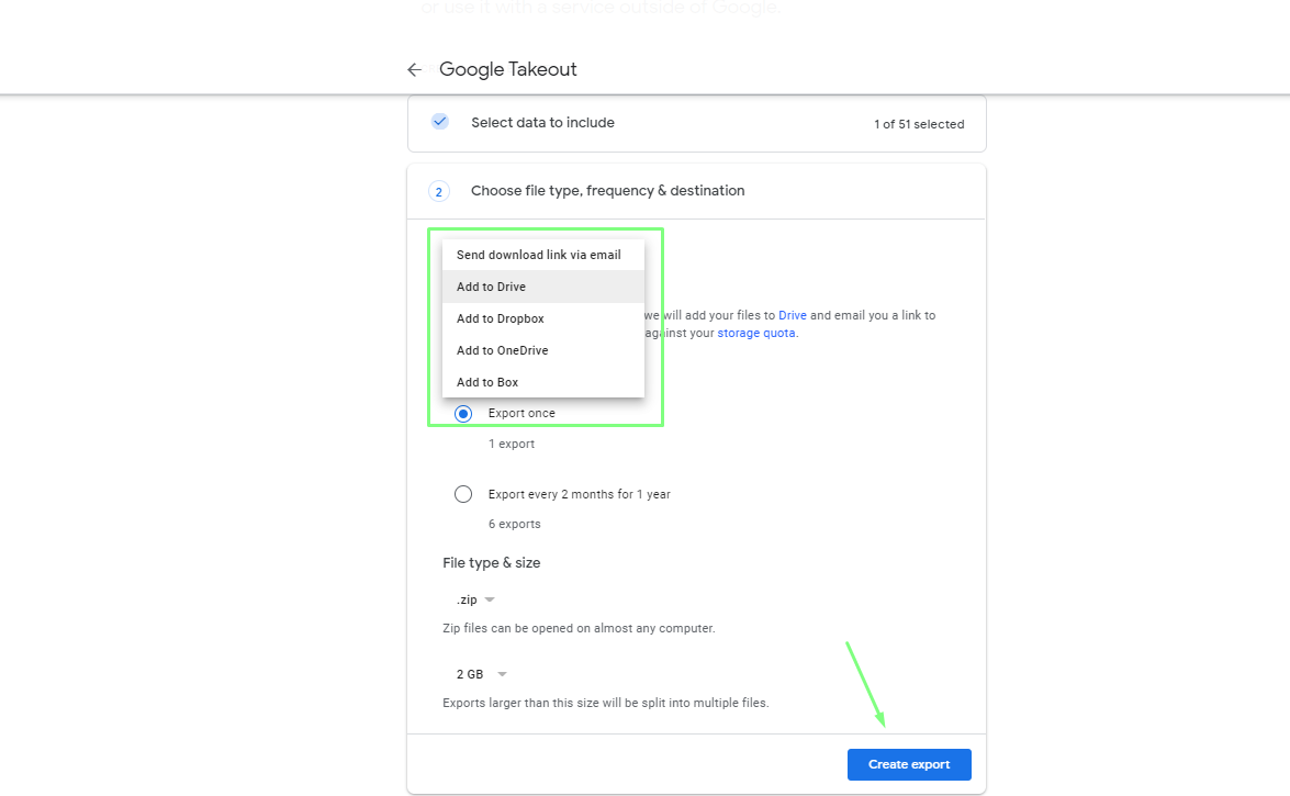 এবার Delivery Method থেকে ” Add to Cloud Drive ” সিলেক্ট করুন। আগে Google Takeout সকল ডাউনলোড লিংক ইমেইলে সেন্ড করতো কিন্তু এখন আপনি সেটা ক্লাউড ড্রাইভে সেভ করতে পারবেন যা আগের চেয়ে অনেক সহজ এবং দ্রুত হয়। আপনার পিসিতে যদি Google Drive sync টুলটি থাকে তাহলে এটি সরাসরি পিসিতে ডাউনলোড হয়ে যাবে।