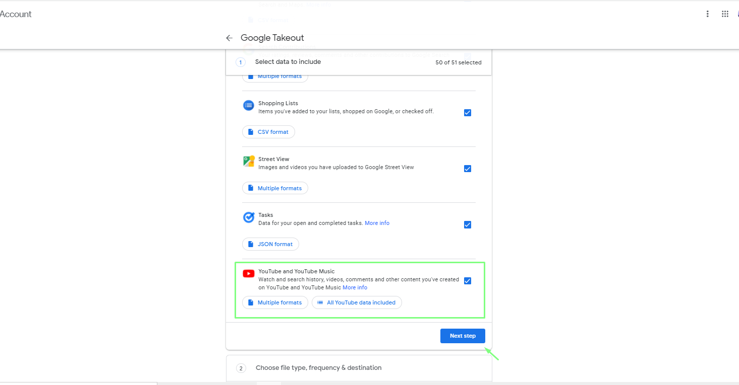 প্রথমে Google Takeout পেজটি ওপেন করুন। নিচের মত পেজ দেখতে পাবেন এখান থেকে YouTube এ চেক দিয়ে Next এ ক্লিক করুন।