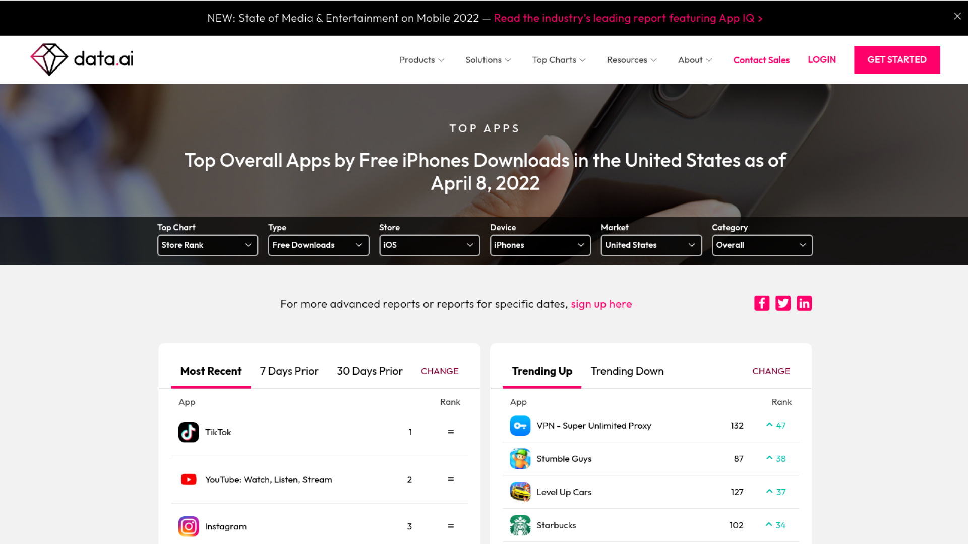 data.ai সেরা ১০০ টি অ্যাপ্লিকেশন এর তালিকায় প্রদর্শন করিয়ে থাকে। এখান থেকে আপনি আপনার পছন্দের অ্যাপ্লিকেশনটি নামিয়ে নিতে পারবেন। data.ai ওয়েবসাইটটিতে ব্যক্তি বা ব্যবহারকারীর রিভিউ থেকে পাওয়া উপাত্ত বিশ্লেষণ করে অ্যাপ্লিকেশন গুলোর Ranking করা হয়ে থাকে।
