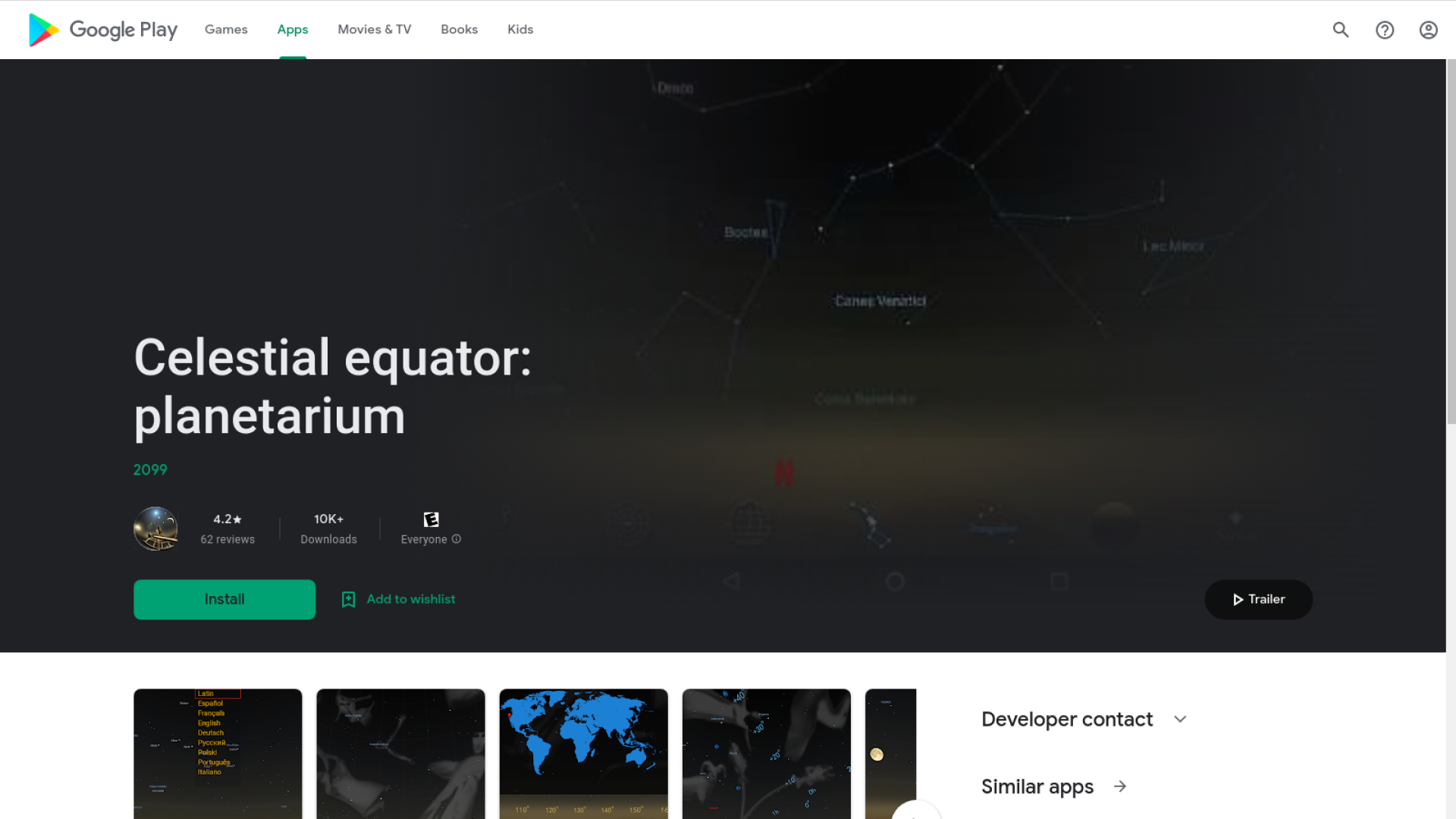 এন্ড্রয়েডের জন্য দারুণ আরেকটি Planetarium অ্যাপ হচ্ছে Celestial Equator। স্ক্রিনের নিচের দিকে এই অ্যাপ এর সকল অপশন গুলো শো করবে, আপনি চাইলে সেটা অফ বা অন করতে পারবেন। আপনি এই অ্যাপ এর মাধ্যমে আপনার আকাশের তারা এবং নক্ষত্রপুঞ্জ দেখতে পাবেন।