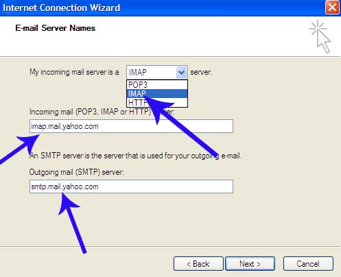 এবার My Incoming mail Server is a তেIMAP সিলেক্ট করুন এবং Incoming Email Server এ লিখুন imap.mail.yahoo.com এবং Outgoing Email Server এ লিখুন smtp.mail.yahoo.com।