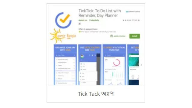 ৫। TickTack: এটি একটি টুডু লিস্ট রিমাইন্ডার অ্যাপ। এটি আপনার সকল ক্লাস, রুটিন ও হোমওয়ার্কের কথা মনে রেখে আপনাকে সময় মত সতর্ক করে দিবে আপনার কাজ শেষ করার ব্যাপারে। এইটা খুবই সহজ ও সুন্দর অ্যাপ এবং ফ্রি। এটি আপনার প্রতিদিনের কাজ অনেক সহজ করে দিবে।