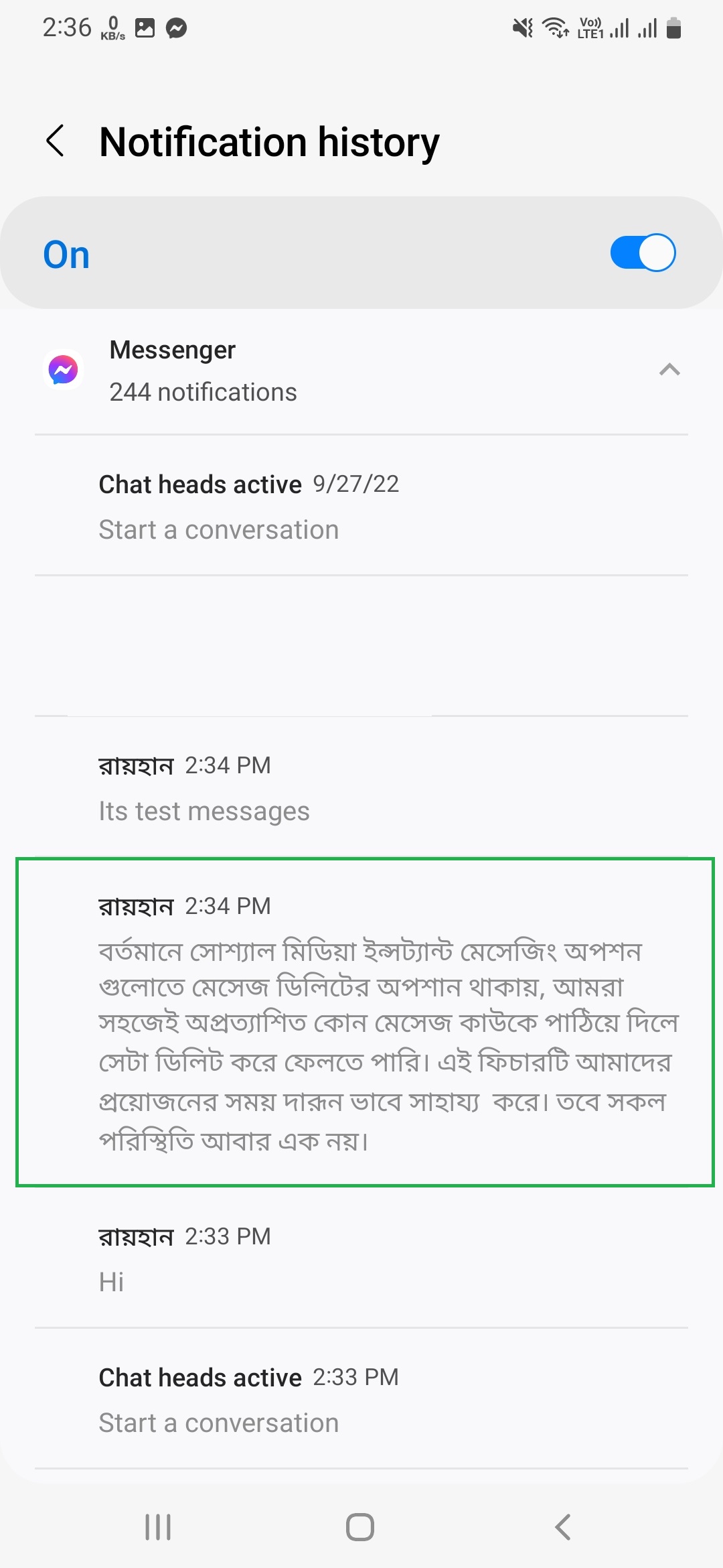 Notification History তে যান এবং সেটা এনেভল করে দিন। এখন থেকে সব মেসেজ দেখানে আসতে থাকবে।
